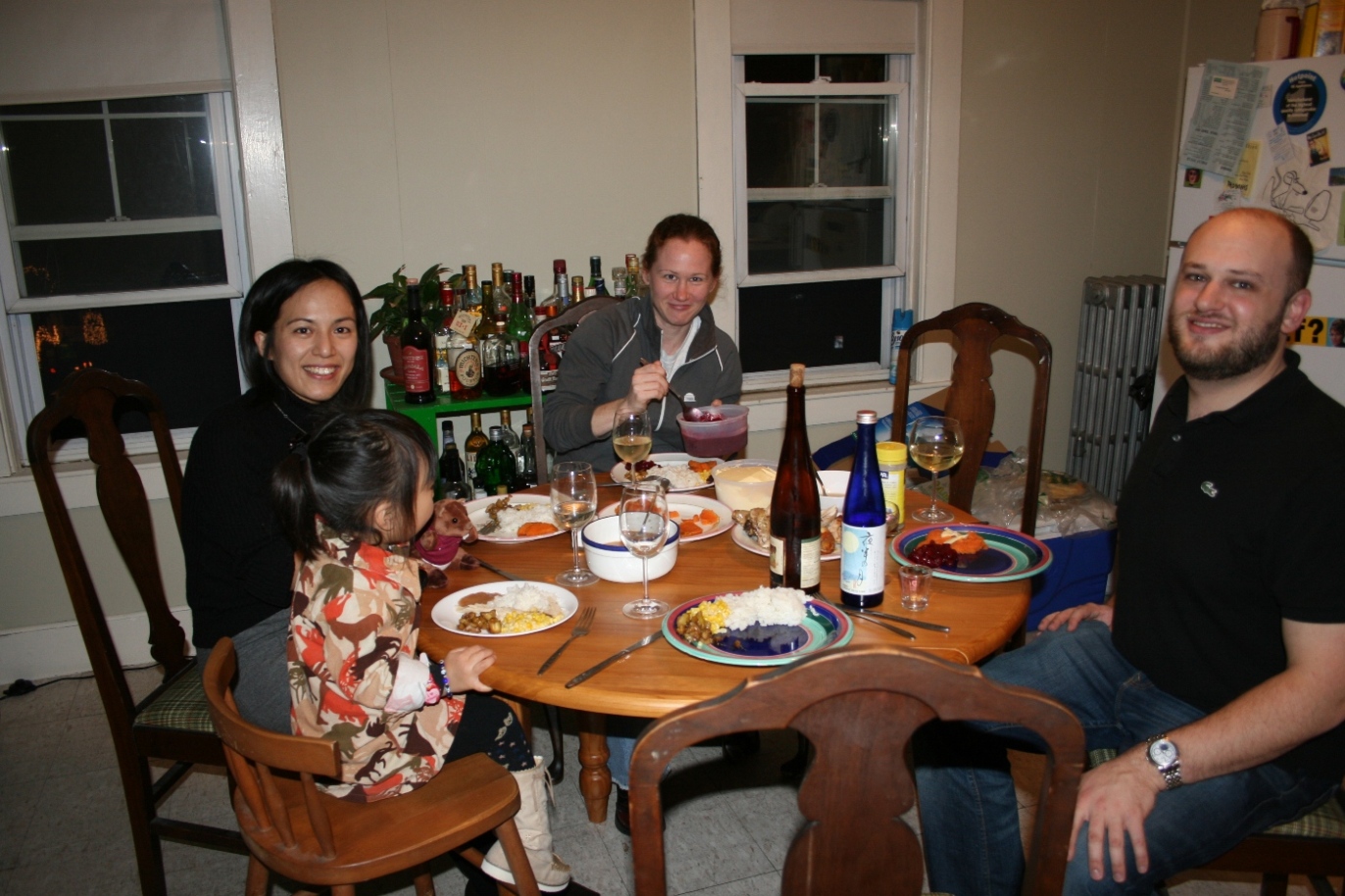 去年は身重の妻が七面鳥を丸焼きにしてくれたが、今年は同級生のDamianのHome dinnerに招いてもらった。こういうのは、別に七面鳥がむちゃくちゃ食べたいからやっているわけではなく、米国文化の体験という意味合いがほとんどなので、「現地人」にご招待いただけると非常に嬉しい。また、New York州北部(=田舎)出身の彼のお母さんが土地の素材を持ってボストンに来て作ってくれる、ということで、味にも期待して、家族で出かけた。