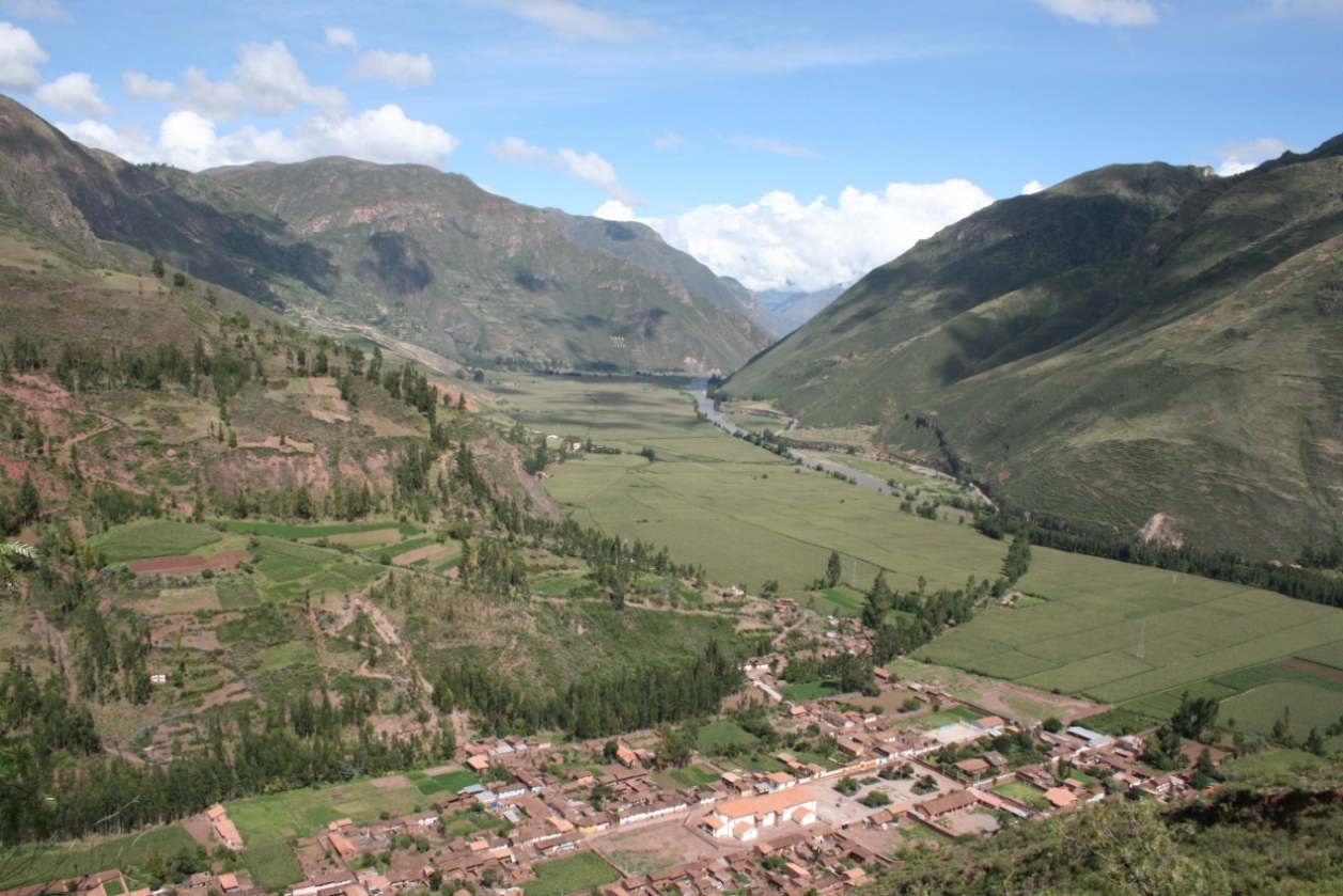 ホテルのドライバーを借り切って、この日はクスコ周辺の遺跡をまわる。インカの聖なる谷(Valle Sagrado de Los Incas)とも呼ばれる地域で、標高6,000m級の山々に囲まれた標高3,000m前後の高原に、かつてのインカ帝国時代の遺跡や、当時から続く村々が点在している。首都クスコの後背地として帝国の食糧供給を支え、また周辺民族の侵入を防ぐ軍事的役割も担っていた地域である。作物はトウモロコシや野菜が中心で、植生も日本やアジアの田園地帯とはかなり異なるはずなのだが、田園や緑の山並の風景はどことなく懐かしく、快晴の天気も手伝って非常に清々しい。