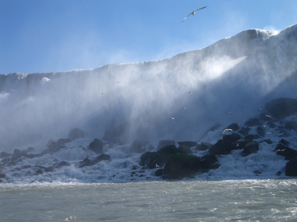 ↓そのGoat島からは、ツルハシで岩を打ち抜いて作ったと言われるエレベーターで滝の下におりて、徒歩でAmerican Fallsに近づくことが出来る。遊覧船から見るよりさらに近く、水しぶきの圧力から滝を直視できない。滝というより、水塊、とでもいう方が近い。どこにでも行きたがる人間の業を感じる。