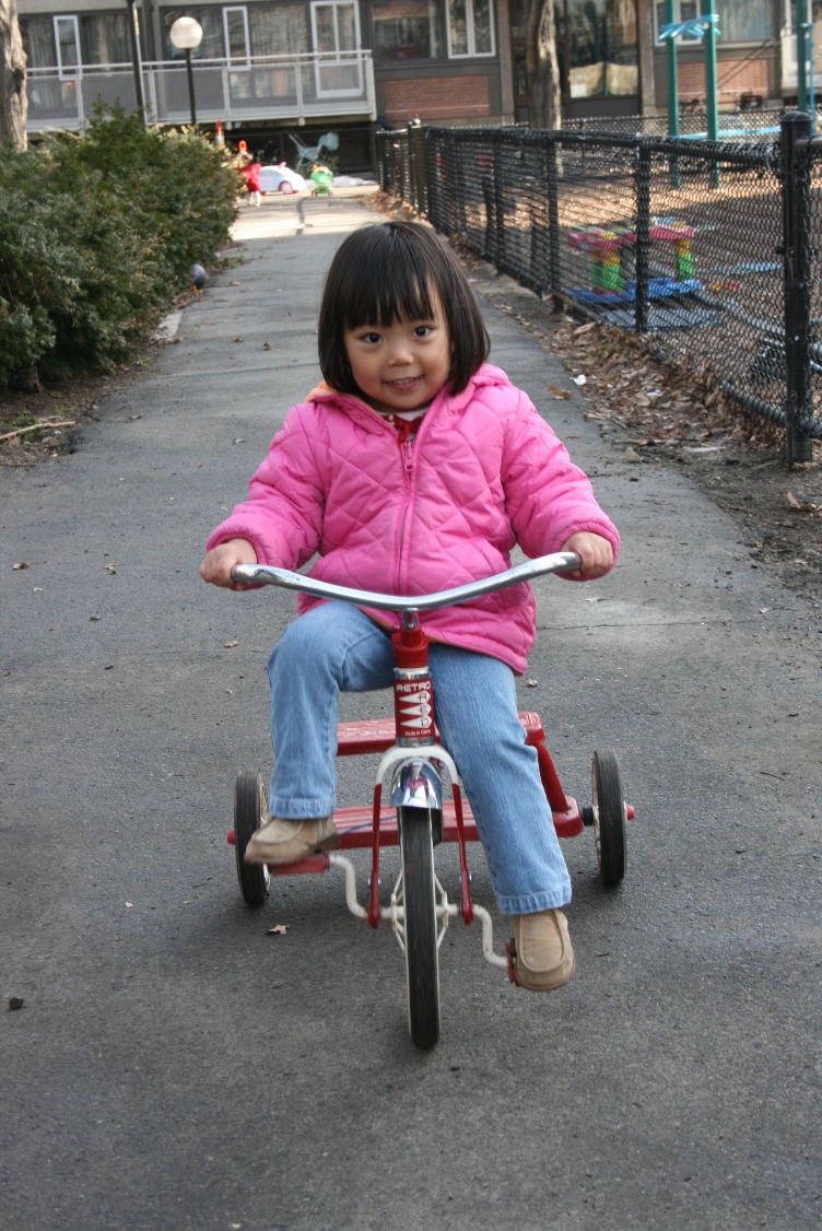 長女は三輪車がちょっとしたブームのようである。唯一彼女のサイズに合う赤い三輪車に乗って、一周100m弱の公園の周りをくるくると回っている。自転車で快走する年上の子供に英語で「どけ!」と言われたりすることもあるが、以前のようには怯まなくなった。
