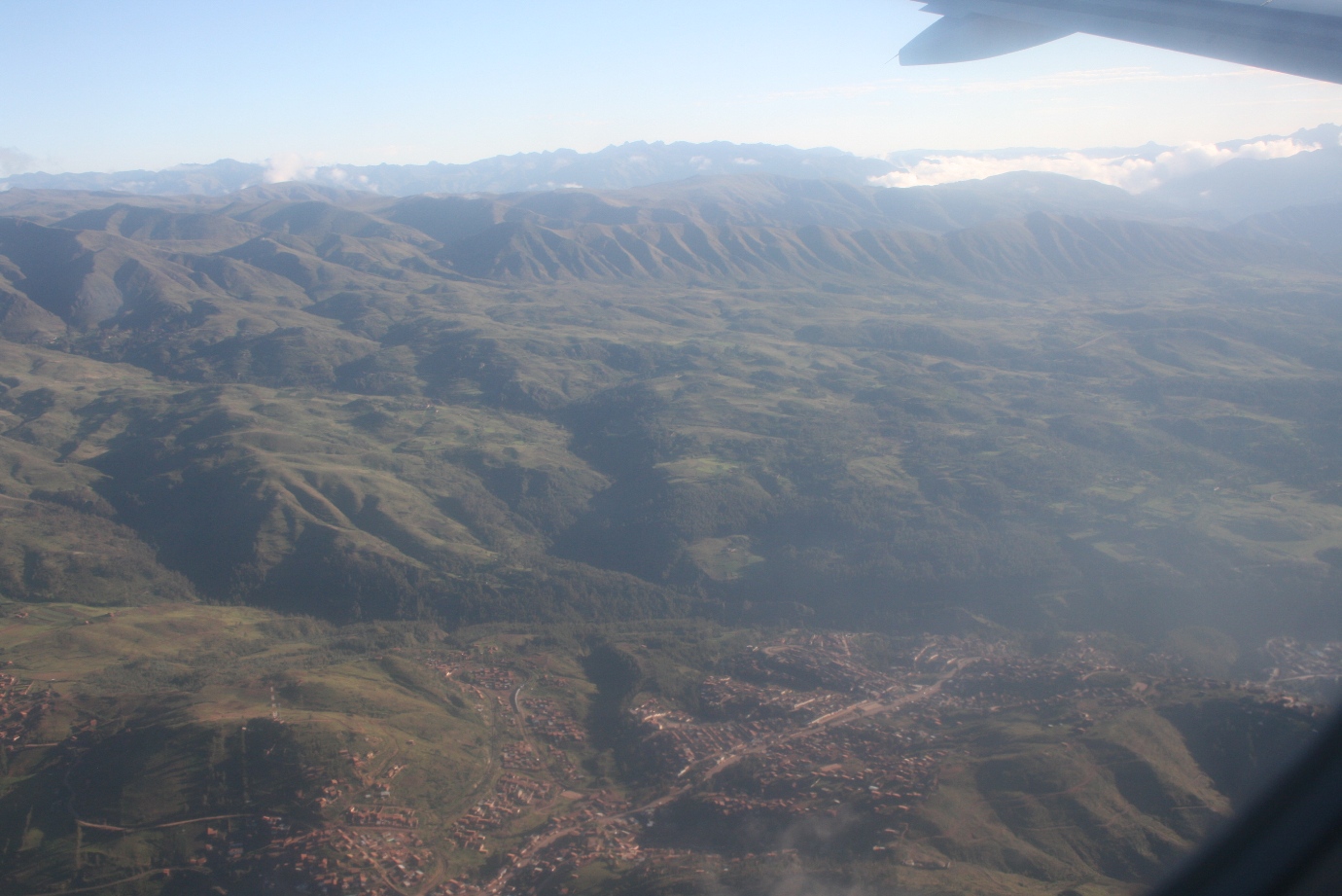 離陸後、1時間ほどで、眼下にアンデスの山並が見えてくる。一部雪の残る頂の傍には、ところどころに村落が見える。山の民インカの雰囲気が漂ってくる。