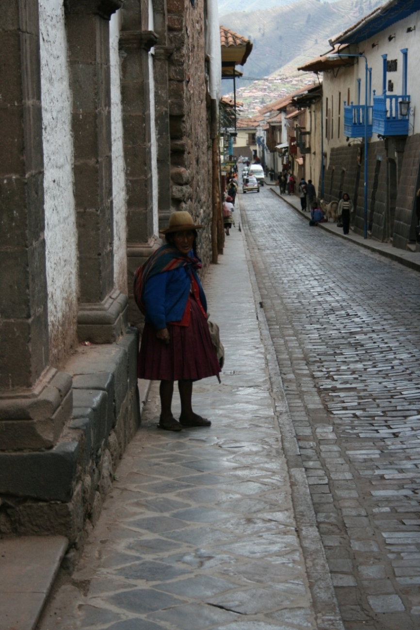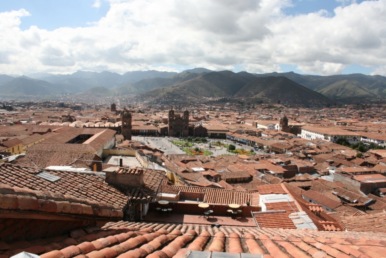 そして赤茶色の瓦葺の家の数が次第に増え、やがてそれが高原を埋めるように広がってくると、そこがクスコの街である。標高3,400m、海から遠く離れ、地図の上ではとても便利な場所とは思えないこの高原に、なぜインカは首都をおいたのか…、と不思議に感じていたが、飛行機の窓外に広がる恵まれた自然環境を見ると、なるほど、と頷かされた。砂漠ばかりのペルー沿岸部とは異なり、山々は緑が溢れ、川には豊かに水が流れて、山々に囲まれた高原は十分に広い。家々はリマ近郊のような税金逃れの作りかけではなくちゃんと完成しており、作りや色合いに統一感があって街並みも美しい。ちょうど日本で京都の古い街並みを訪れたような、歴史と文化の香りが漂ってきて、観光客心をくすぐられる。