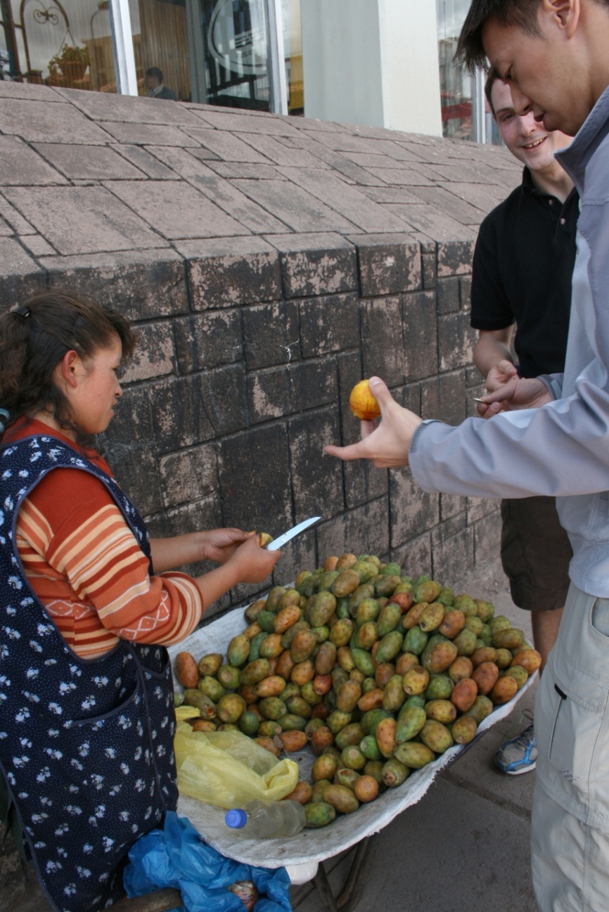 旅に出ると、食生活の偏りから、ビタミン不足に陥りやすい。そんな人にはフルーツが一番、ということで、Robinが路上で売られている不思議な果物を勧めてくれた。サボテンの一種の実らしい。地元の人はまとめて買い求めていくが、観光客にはその場で皮を剥いて食べさせてくれる。食べてみると、熟れた柿のような食感ながら甘酸っぱく、なるほどビタミンが採れそうな気がした。