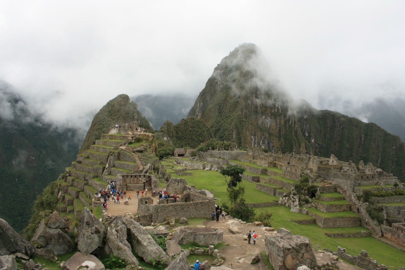 あいにく小雨が降っている。村から400m上の尾根にある遺跡へは、シャトルバスで向かう。遺跡の標高は約2,400~2,800m。ちょうど雲の中にあって、風景が霞んでいる。観光客も多く、狭い石畳は滑りやすく、歩くだけでも一苦労だが、ひとまず遺跡の一端にある見張り小屋を目指す。すると、小屋に着こうとする頃、雲がさっと流れ、眼前にマチュピチュ遺跡の全景が姿を現した。息を呑む威容である。小屋の近くの段々畑に腰を下ろして、しばらく雲に洗われる遺跡の全景とその背景の山並を眺める。歴史の重みか、これを作り上げる過程で注ぎ込まれた人の努力の重みがそうさせるのか、染み渡るような感動が沸きあがってくる。