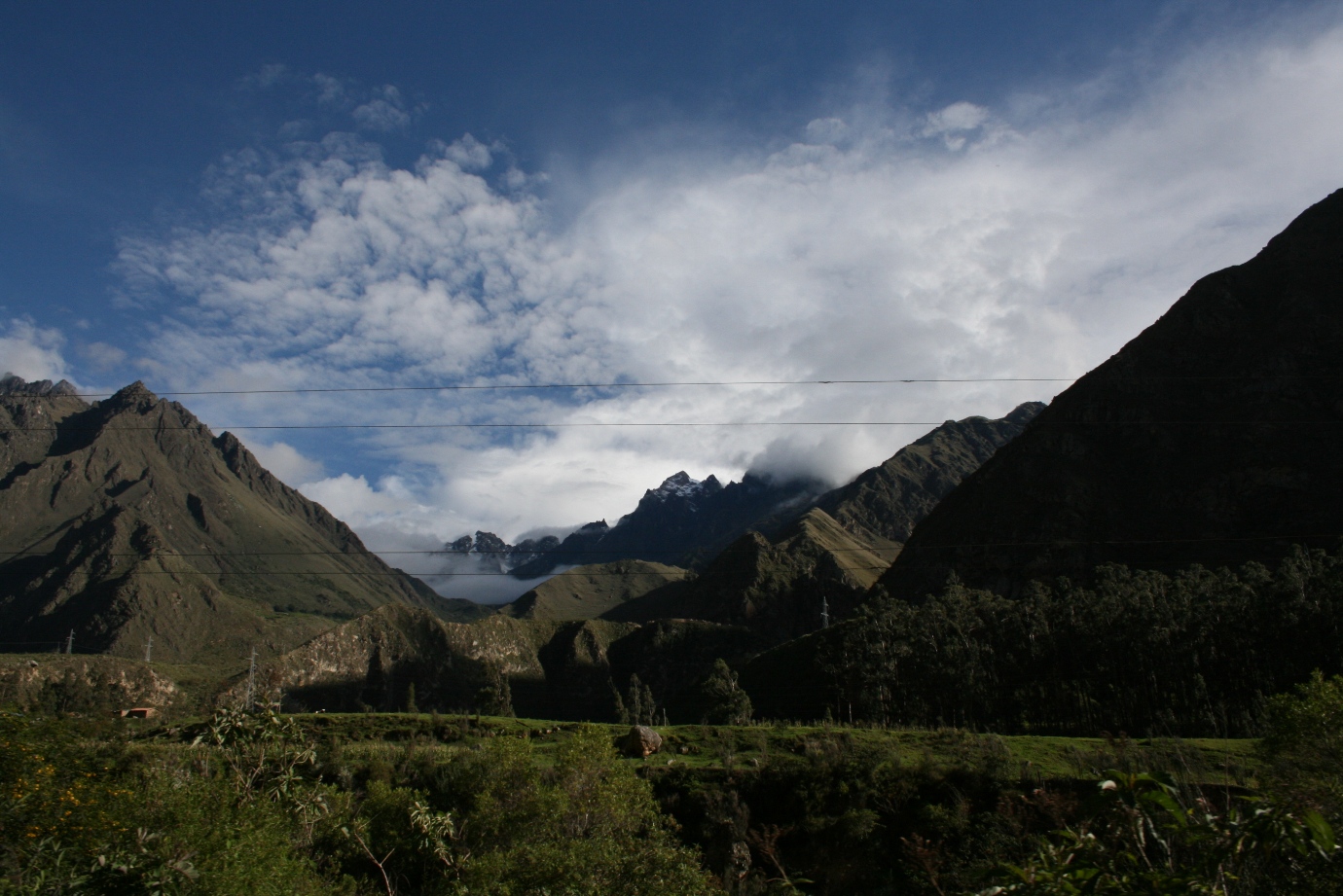 朝6時(今朝も早起き)に出発した列車は、スイッチバックを繰り返しながらクスコ盆地の壁面の狭い斜面を登り、一段高いところに広がる高原を走り抜けて、北流するウルバンバ川に沿って、遠く北部ジャングル地帯へと続く峡谷に入り込んでゆく。途中の高原は、畜農混合の長閑な田園風景。Robinが先日「ペルーでは誰も飢えていない」と言っていたが、この景色をみると納得がいく。人々の様子も穏やかで、決して楽ではないが、のんびりと平和な暮らしが営まれている。