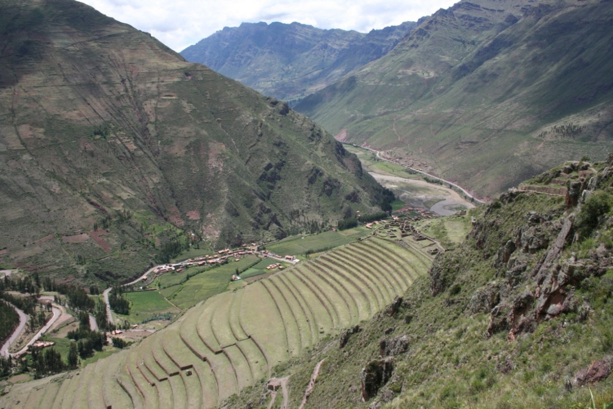 最初に訪れたのは、ピサック(Pisaq)の街。谷間に開かれた田園風景と現在の集落を見下ろすように、遺跡と段々畑が丘の斜面に築かれている。