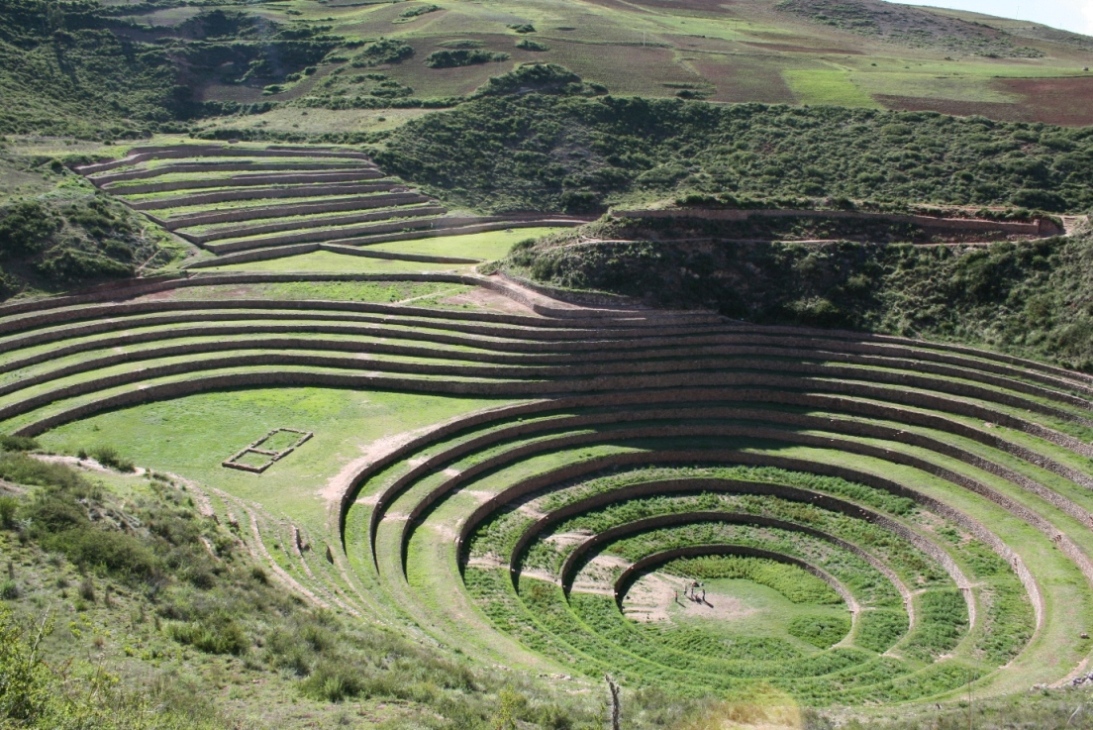 モライ(Moray)という遺跡は、インカ時代の農業試験場の跡。窪地を利用して円形に作られた段々畑で、大きいところでは深さ30mにも達する。最上層と最下層では気温差が摂氏5度以上もあるらしく、そうして創り出されたmicro climateを利用して、それぞれに適した作物を研究していたらしい。インカが山岳農業のプロであったことが良くわかる。