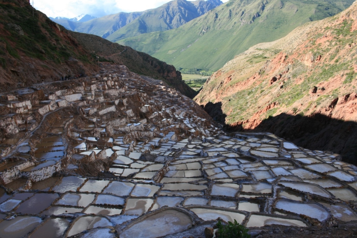 またその近くにあるマラス(Maras)という町の郊外には、インカ時代以前から続く塩田が今も現役で活躍している。山に湧く高塩分の温泉を棚田に似た階段状の小池に流し込んで、天日で水分を蒸発させて残った塩の結晶を採取する仕組み。山の生活で課題となる塩分の確保のために考え出された方法である。600年以上に渡って拡張が続けられ、今では全長数km、小池の数は4,000近いという。何より、今でも実用に供しているところが凄い。