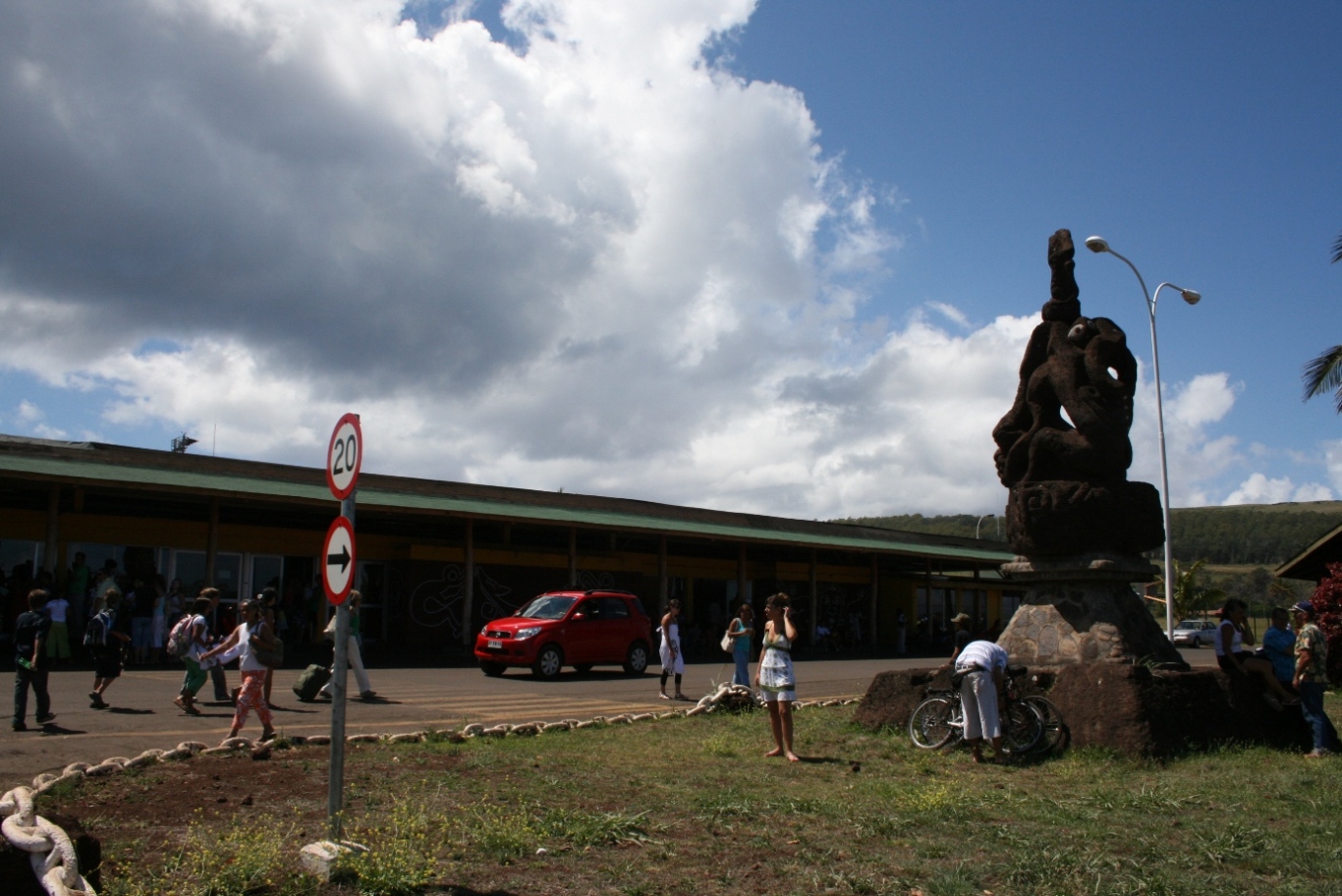 やがて飛行機は着陸体勢に入ったが、窓外には何も見えてこない。島が小さすぎ、また絶海の孤島であるために、いつまでたっても海しかみえないのだろう。そう思っていると、突然陸地が見えた。断崖に囲まれて、いくつかの丘が連なっている。陽気なラテン系の乗客は大興奮。皆それほどまでモアイが見たかったのか。機体は一度島を過ぎ、旋回して着陸した。地上に降り立つと、強い日差しと海洋性の粘着質な空気が身体にまとわりつく。
