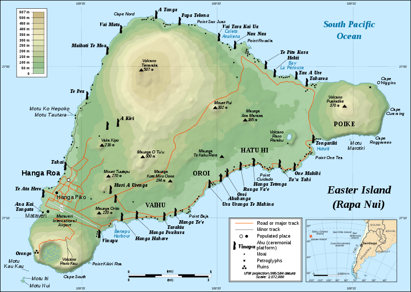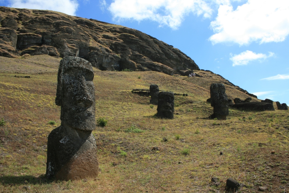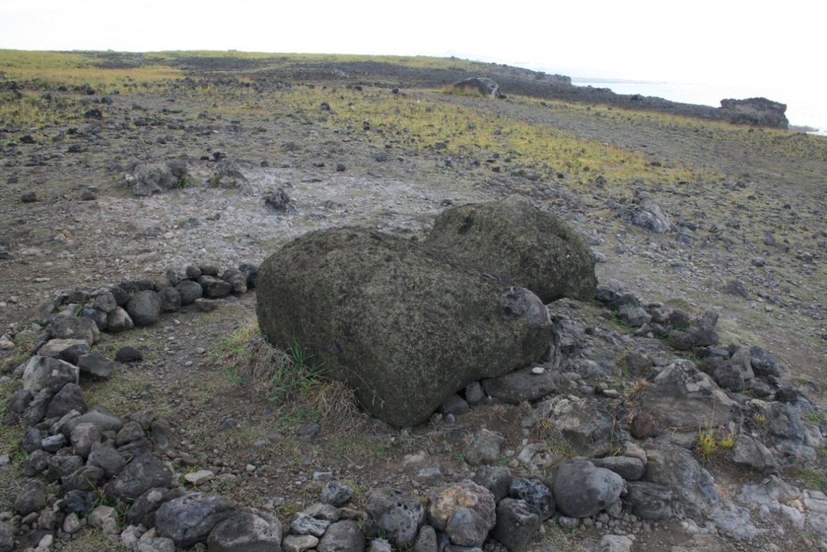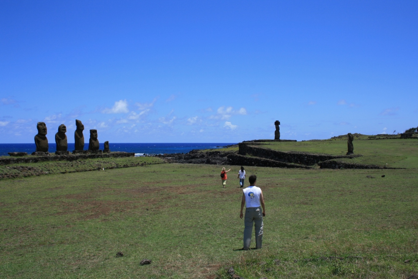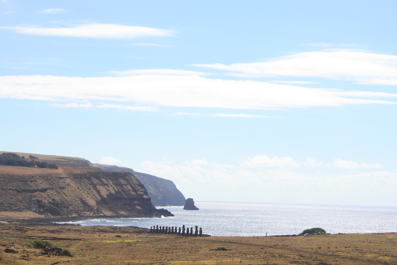 島の西端にあるハンガ・ロア(Hanga Roa)村を発し、荒波の打ちつける南海岸を東へと進む。このあたりのモアイは、全て16-17世紀のいわゆる「モアイ倒し戦争」*で倒されたままの姿で放置されている。モアイの目に宿る霊気を恐れてうつ伏せに倒されたものが多く、アフ(祭壇)から波を背にして丘の方に前のめりに倒れている。頭に載せられていたプカオといわれる装飾は散乱し、モアイの本体も頭部が折れたり、土に埋もれたり、風化が進んで崩れたりしているものが少なくない。何もいわずに何百年も土に顔を伏せているモアイの姿は、実に物悲しい。中には子供を表していたかと思われるモアイもあり、尚更不憫に思う。