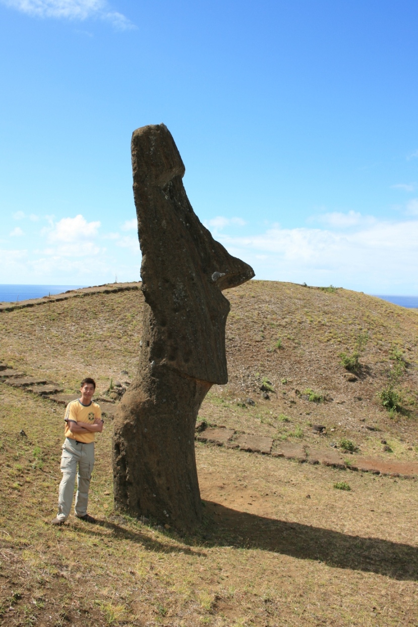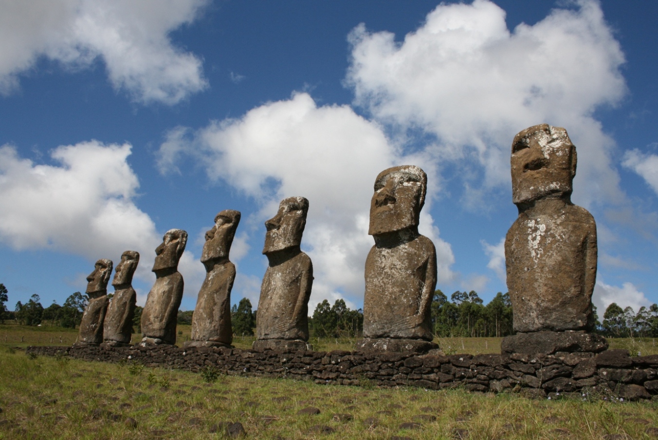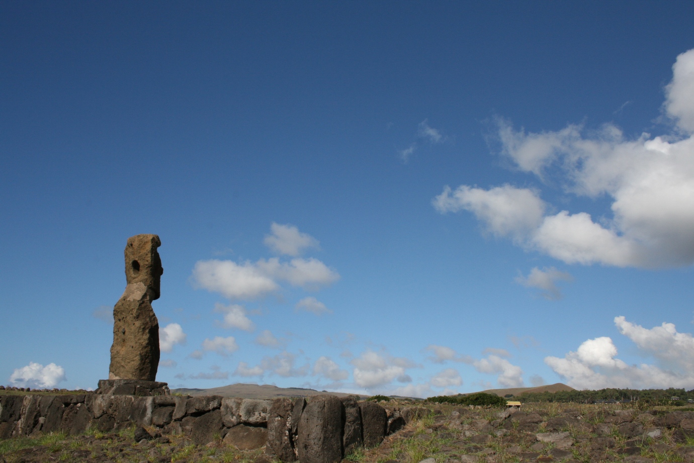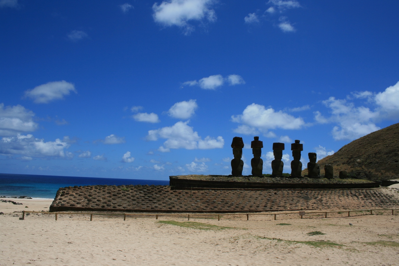 イースター島に初めてやってきた7人の人間(=全島民の祖先)を象徴しているのだとか。島に1,000体近く残るモアイ像のうち、海に向かって立っているのはここだけらしい。これは、通常モアイが海沿いに建設されたアフ(祭壇)を守るために島民の側(つまり内陸側)に向かって立てられたのに対し、ここのモアイのみは島全体を外敵から守るために、島の外(つまり海側)に向かって立っているのだという。潮風に浸蝕された度合いが少ない分、手の造形などがよく保存されている。まあでも、向きが違うだけで要するにモアイでしょ、と言われてしまえば、おっしゃるとおり。ちなみにここのモアイがたつアフの背後で、人骨が多数見つかり、モアイの謎を解く有力な手がかりと注目されたが、イギリス人が運び去ってしまい、今はすべて大英博物館に保管されているらしい。恐るべし、イギリス人。