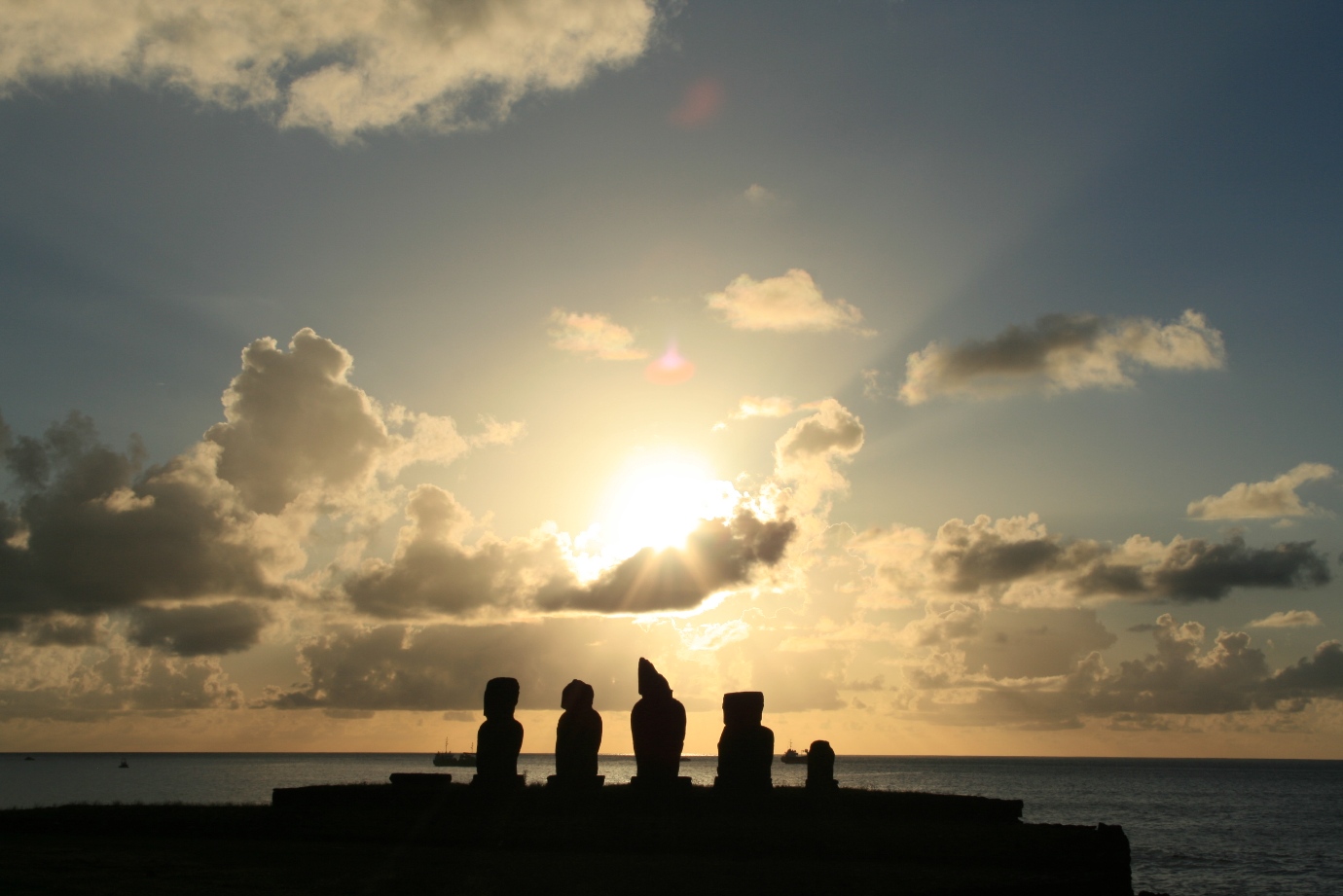 半日島を周って20体ほどのモアイを見ると、少し飽きてくる。感動レベルも相変わらず低い。しかし夕方(と言っても夜9時頃だが)、最初のモアイ(タハイ遺跡)に戻って、モアイ群とその背後に沈んでいく太陽を眺めていると、静かな感動が湧き上がってきた。マチュピチュで得た感動とはまた違う、切ないような、なんともいえない感傷だったように思う。