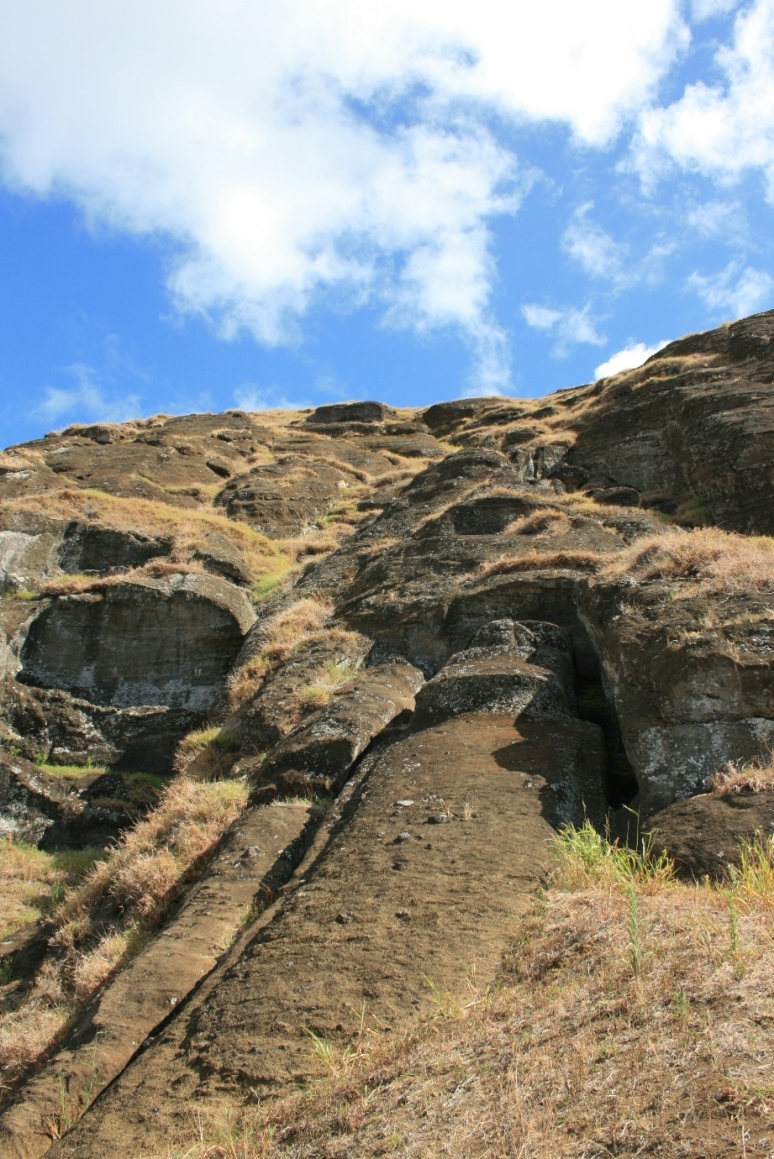 さらに石切り場には岩壁を削って造成中のモアイも放置されている。モアイ信仰に基づく社会システムが突如として終焉したことが、いかにもよく伝わってくる。