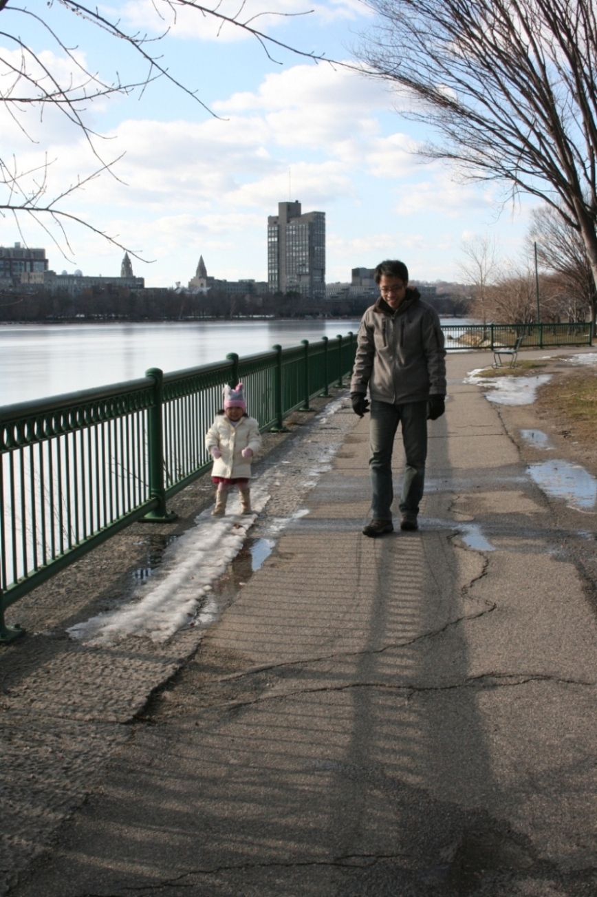 Charles川はまだ凍っているが、雪は路肩を除いてほぼ完全に融けており、さほど散歩の邪魔にはならない。