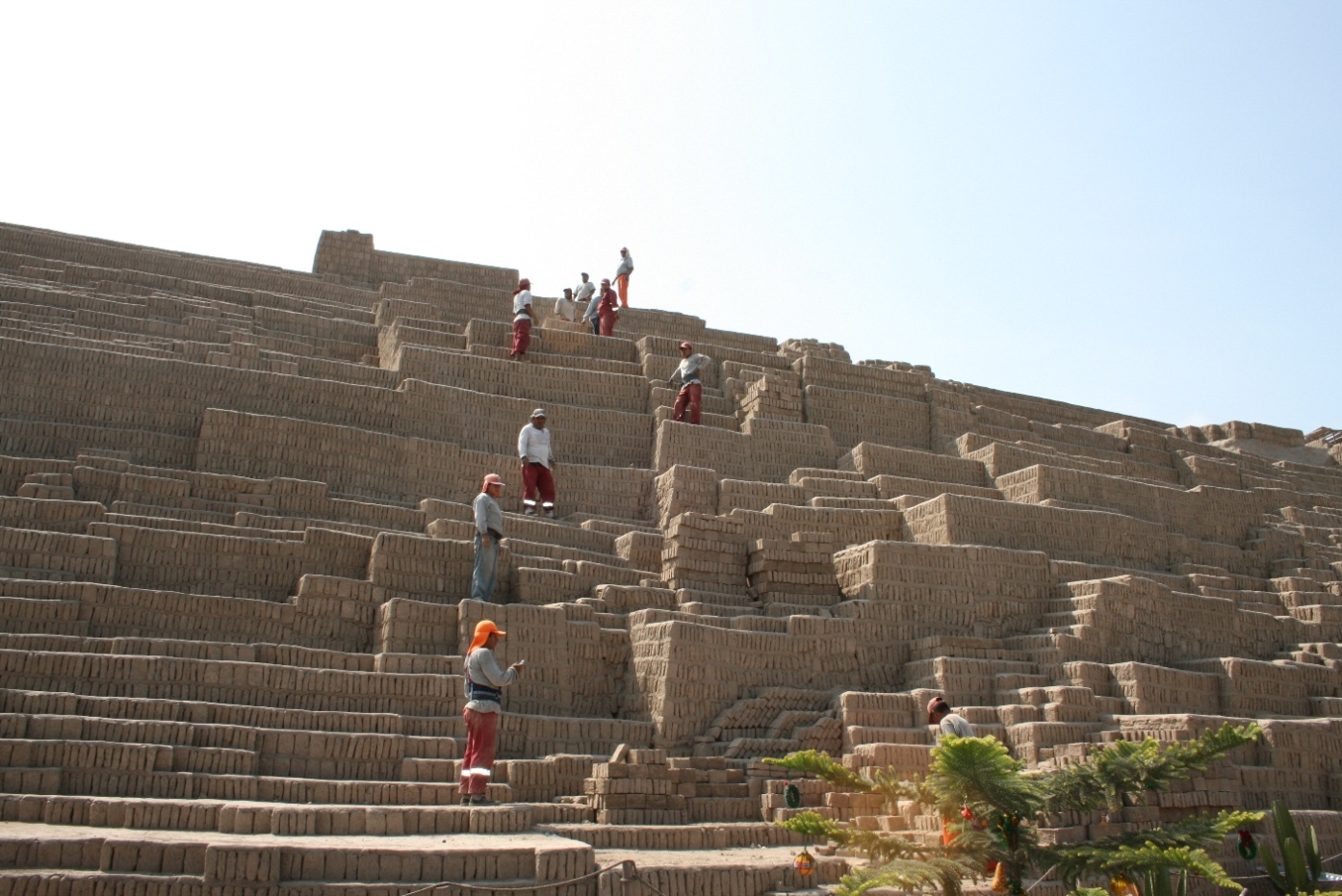 午後は新市街の外れにある古代のピラミッドへ。インカ帝国よりもずっと古い古代リマ文化時代(紀元6-8世紀)のものだそうで、日干しレンガを接着剤を使わずに積み上げるのが同文化に代表的な建築手法らしい。遺跡は復元中で、今も手作業で失われた部分のレンガが積み上げられていた。