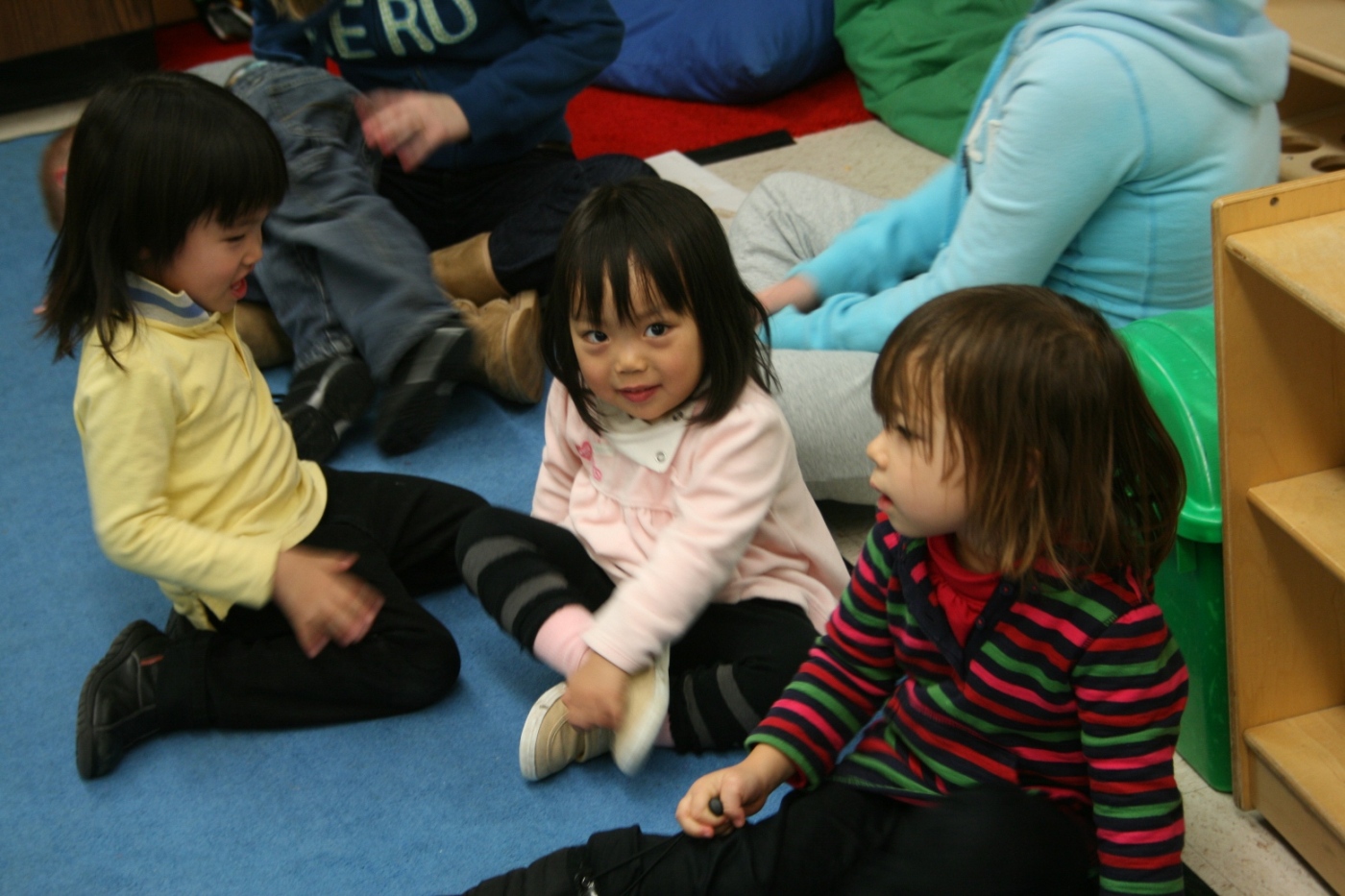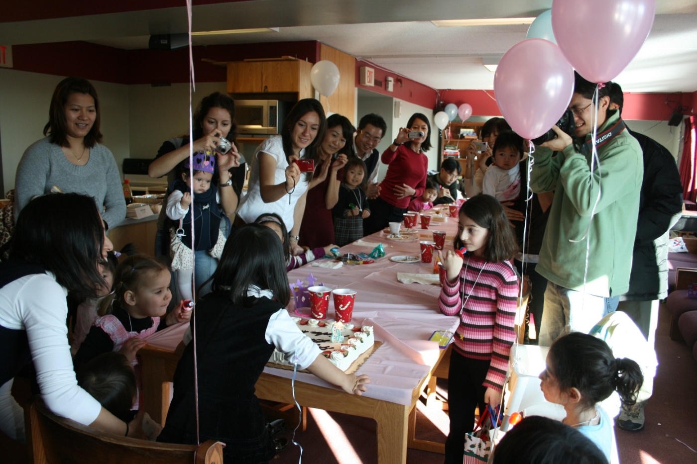 しかし何より行って良かったと思ったのは、Preschoolで過ごす娘の普段の姿を垣間見ることができたこと。なにせ、朝送っていくときには、今でも毎日別れ際に泣いてしまうので、保護者懇談で先生から「泣くのは最初の2-3分だけで、その後はずっと良い子ですよ」と言われていても、この子は本当にちゃんと適応できているのだろうか、と多かれ少なかれ不安に思っていた。この日も、訪れた我々の姿を見つけたら、真っ先に走り寄ってくるだろう、と想像していた。ところが、いざ行ってみると、親の心配をよそに、娘はすっかり馴染んでいた。パーティーの開始が遅れ、我々は結果的にかなり早く着いてしまったのだが、そのとき子供たちは集まって、絵本を読み聞かせてもらっていた。我が娘はその輪の中心にいて、我々の姿を見つけても笑顔で手を振るばかりで、一向にこちらに来ようとしない。他の子供の方が、親に走り寄ったりはしゃいだりしている中で、である。しかも普段から仲の良い友達とじゃれあったり、何やらヒソヒソ話をしたり(当然英語)、手を繋いで走り回ったりしているではないか。