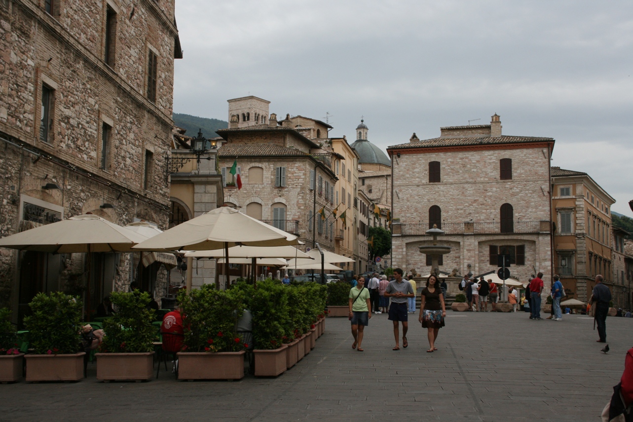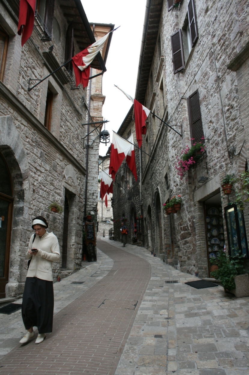 観光の目玉は世界遺産の街、アッシジ。聖フランチェスコの出身地であるため、米国サンフランシスコの姉妹都市にもなっているが、当然街並みはサンフランシスコとはまったく関係なく、丘の上に累々と築き上げられた城壁都市の傑作である。1997年の大地震でほとんど崩壊したものを、イタリア人が誇りと執念で崩壊前とほぼ同じ状態に再建したという。お陰で見事な街並みが今でも見られるわけだが、もともとレンガではなく石積みが多い壁のところどころは、新しいレンガや石、漆喰で固められていて、地震の傷跡を感じさせる。