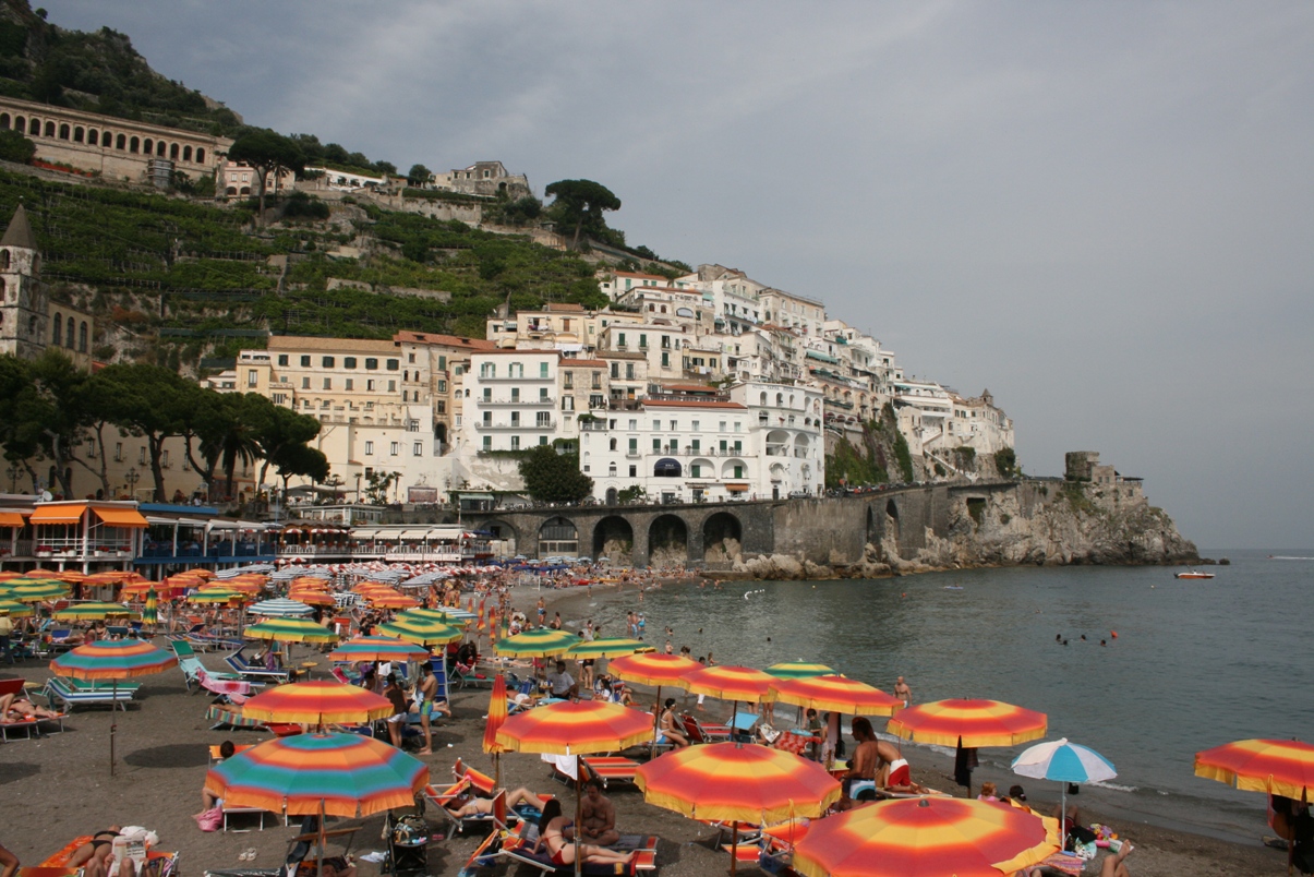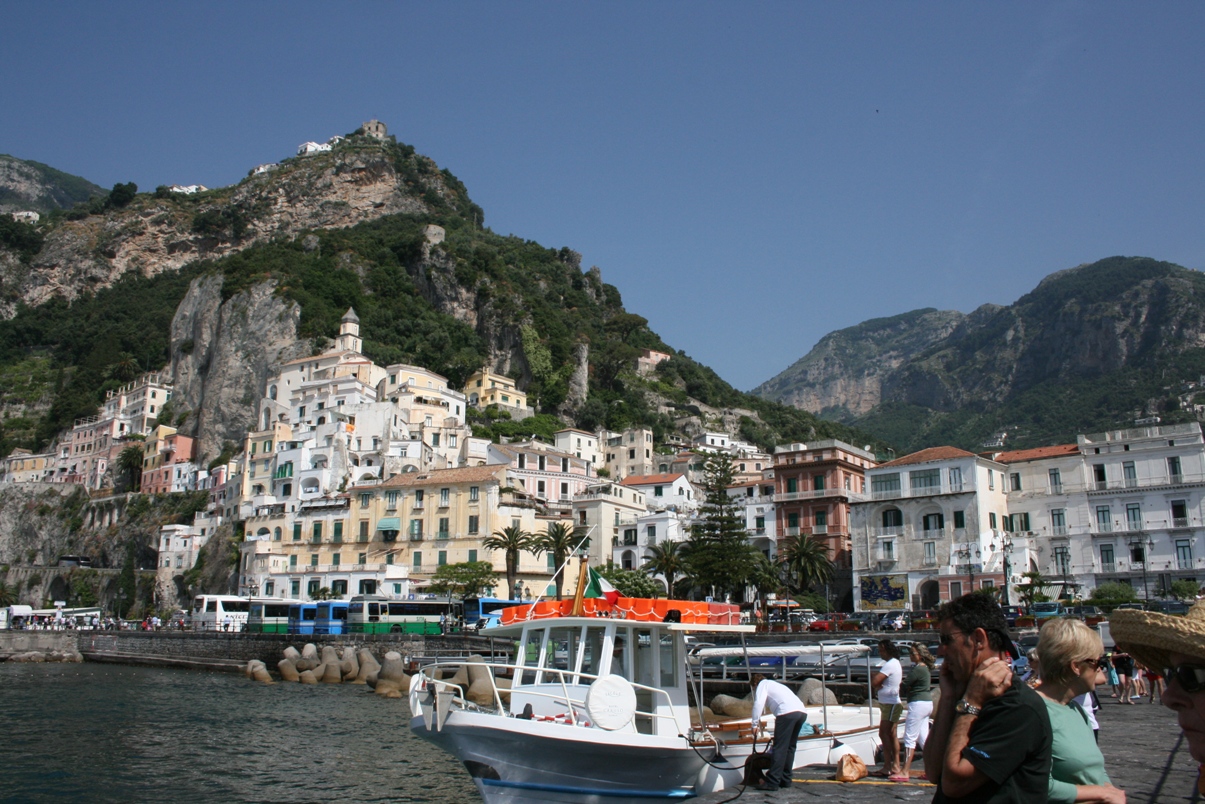 そうして苦労して到着したアマルフィは、急峻と青い海、淡い色の街並みの組み合わせが美しい町。掃き溜めのようなささやかな平地に重なり合うように立ち並ぶ建物。街中に入ると、土産物屋と観光客が犇めき合い、想像以上に大衆的で(旅の初めのころに訪れたリビエラの街の方が随分と上品で歩きやすい)、あまり美しいとはいえないが、海辺から眺めると、独特の旅情をかきたてられる。