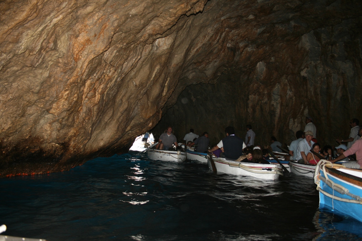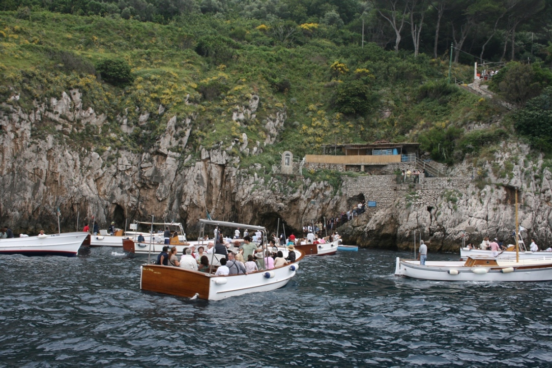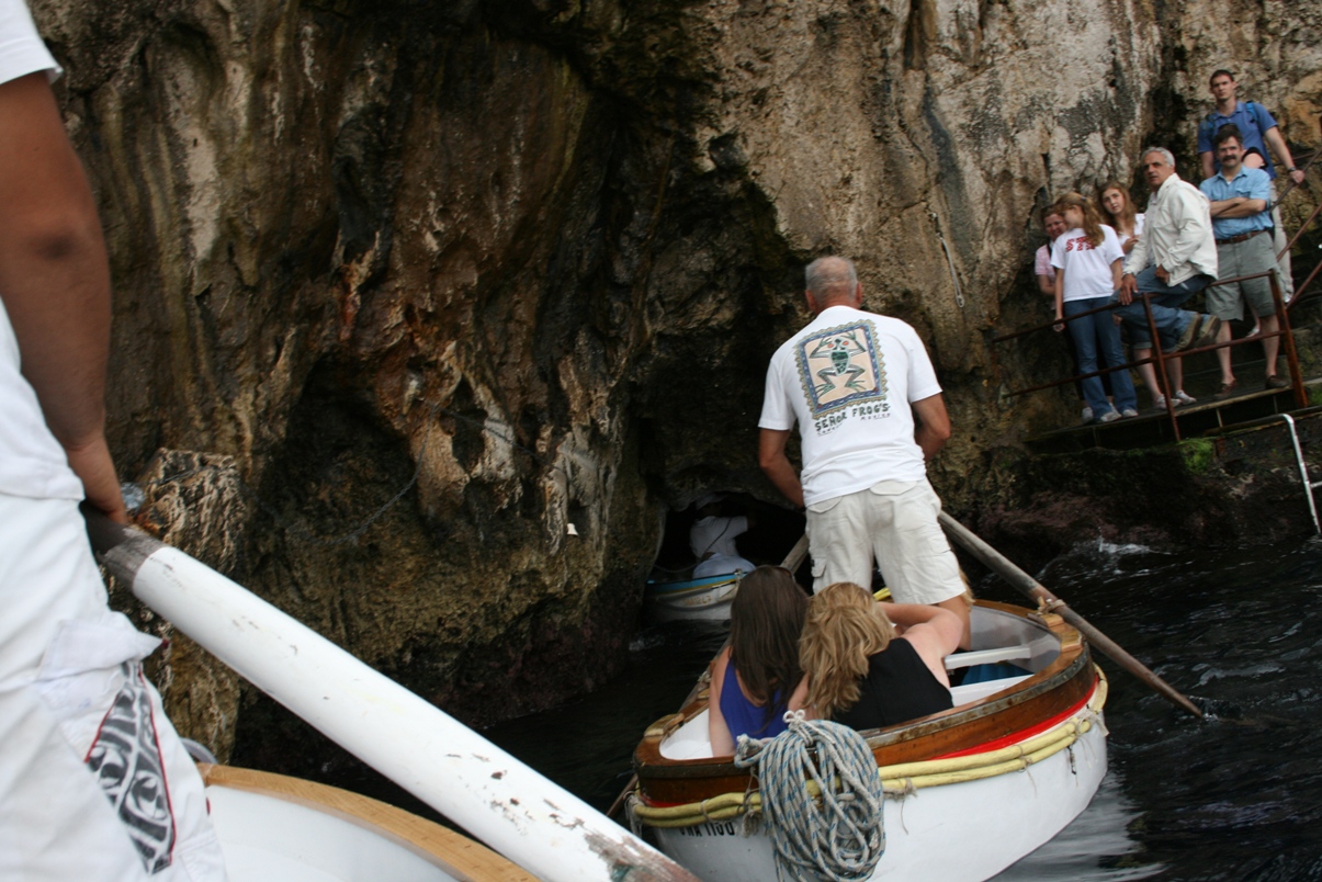 洞窟の入り口は、海面からの高さが1mにも満たない小穴であるため、3-4人乗りの手漕ぎボートに乗り換えなくてはならない。しかしながら洞窟のスペースと、それに伴うボートの数に限りがある。一方で、洞窟に入りたい観光客を乗せた船は次々と到着する。バスやタクシーで陸路やってくる人もいる。要するに、手漕ぎボートに乗り換えるまでの順番待ちが発生する。