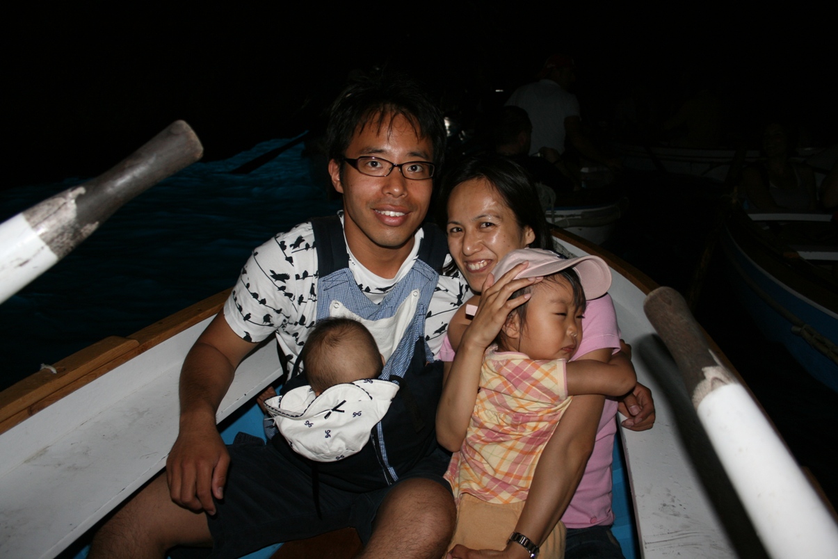 確かに洞窟の外から海中を通じて差し込む太陽光が、洞窟の海水を底から青く照らして、神秘的な色合いを見せているが、窮屈なボートの中で、娘は怖がって泣き始めるし、まったくロマンチックでもなんでもない。なんとか船頭に家族写真を撮ってもらったが、真っ暗で何だかわからない。子連れでの訪問を考えている方には、是非やめたほうがいいと助言したい。