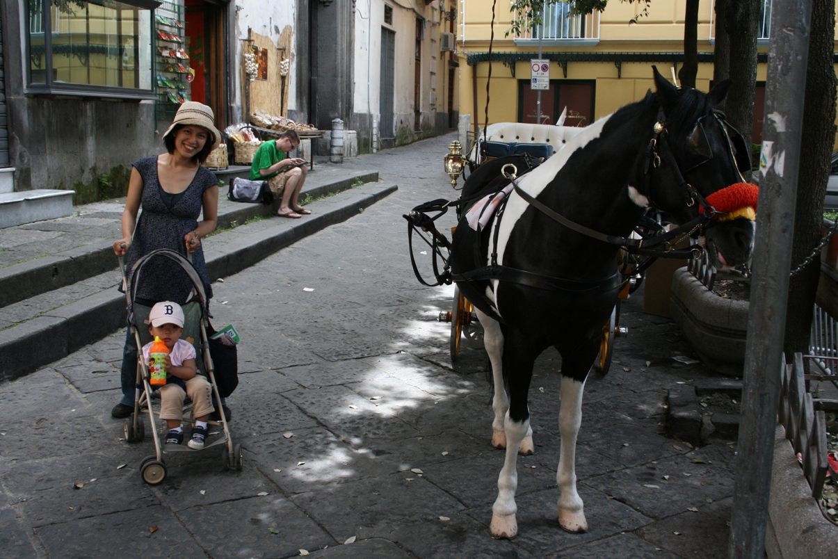 イタリアはほとんどの観光地で、観光用の馬車を見かけるが、このソレントも例外ではない。これを見かけるたびに、長女の機嫌が良くなるので、いつも助かる。