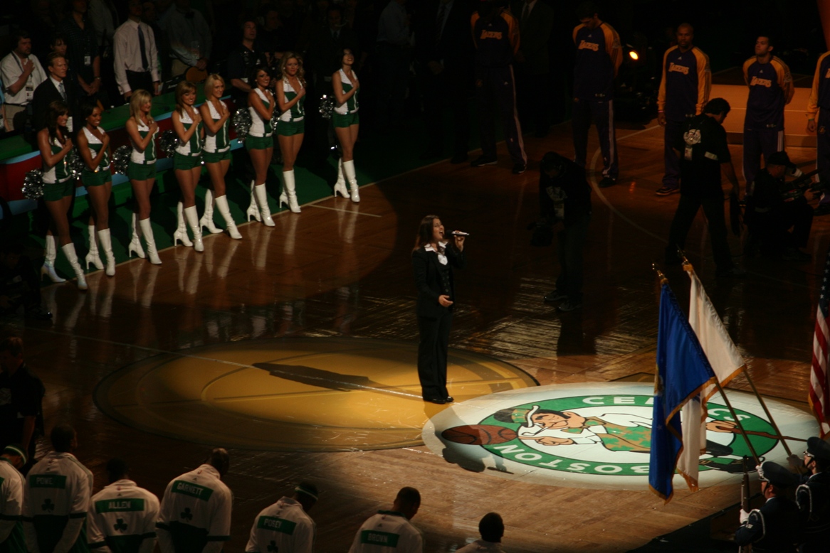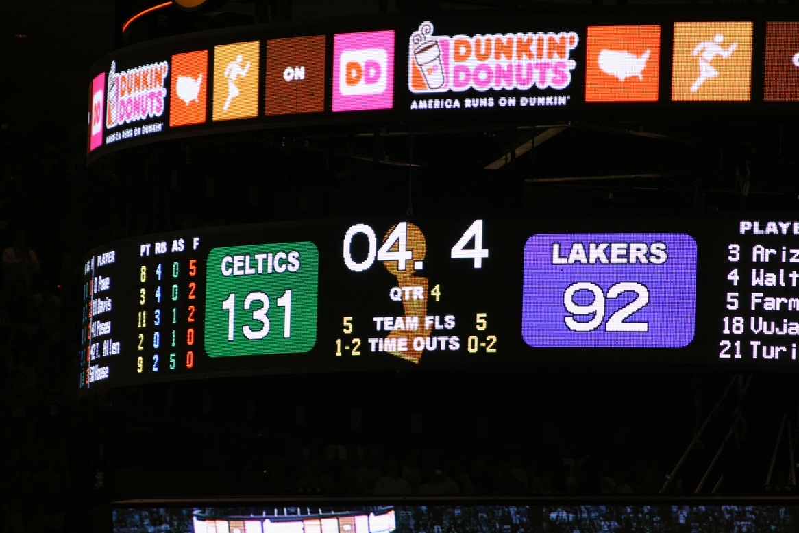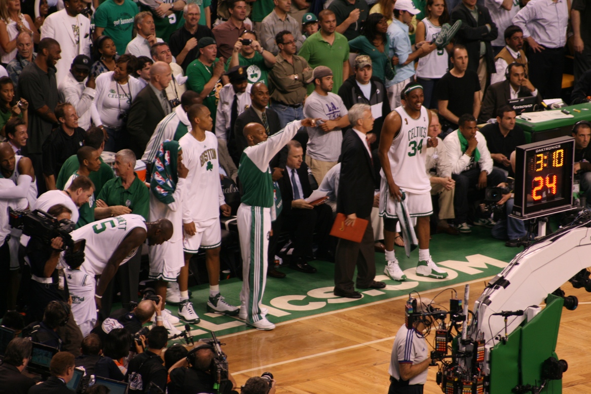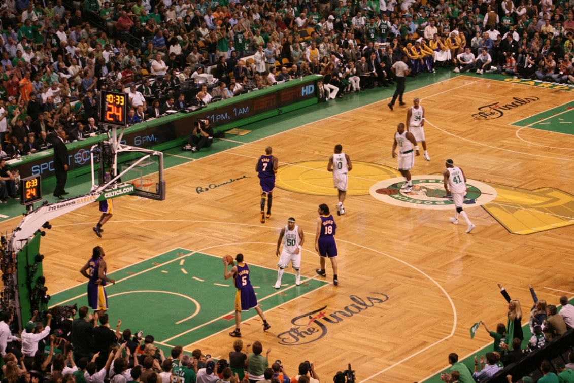 試合は本当の出足を除いてセルティックスが一貫してリード。ガネット、ロンド、レイ・アレン、ピエルスといった主力どころが、争うように得点を決めていく。対するレイカーズは、エースのコービー・ブライアントが抑えられ(と言ってもチームで彼だけが20点以上得点していたが)、ホームゲームに比べるとシュートの決定力も低く、なかなか反撃ののろしが上がらない。やはりホームのアドバンテージは大きいのか。