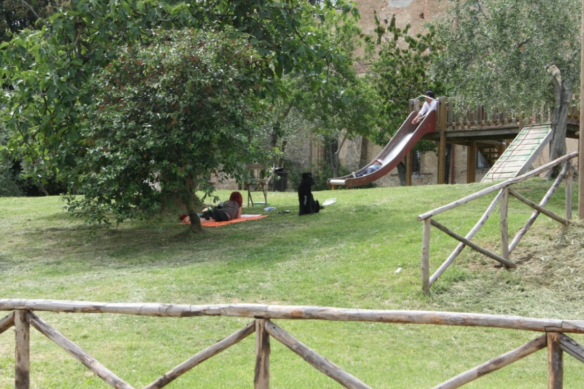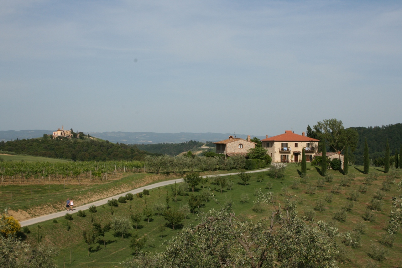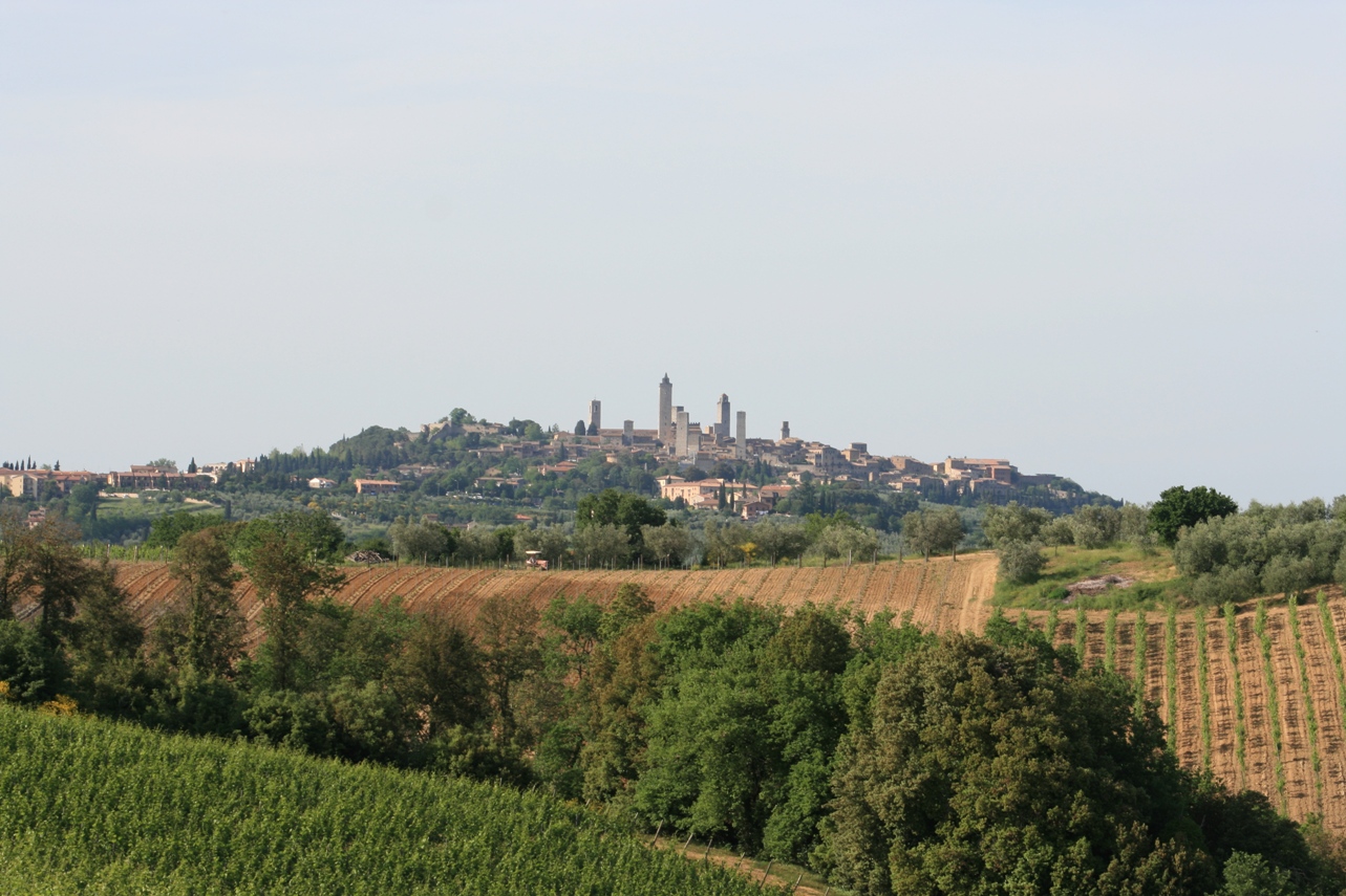 この日から3泊の予定でとったのは、このあたりのアグリ・ツーリズモと呼ばれる農家風の民宿のひとつである。自ら敷地内で葡萄を栽培したり、有機野菜を作ったりしつつ、旅行者に部屋を貸している。イタリア語しかできない宿も多いが、スローンの学生の推薦で訪れたその宿は、英語、ドイツ語もOKで、外国人客が多いようだった。部屋も広く、何より大自然と向き合っているようで、なかなかのものである。丘の向こうには、サン・ジミニャーノの町もみえる。