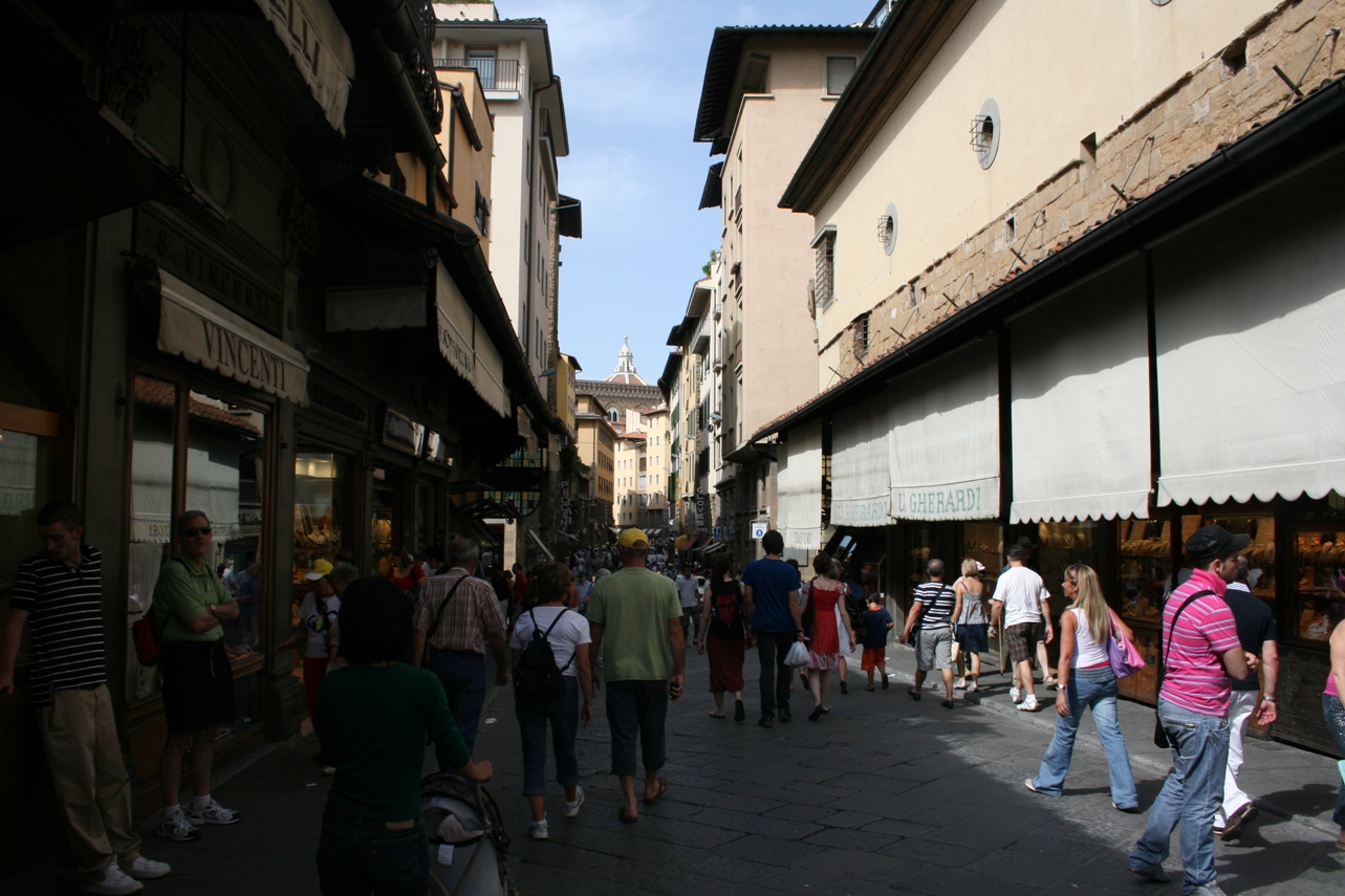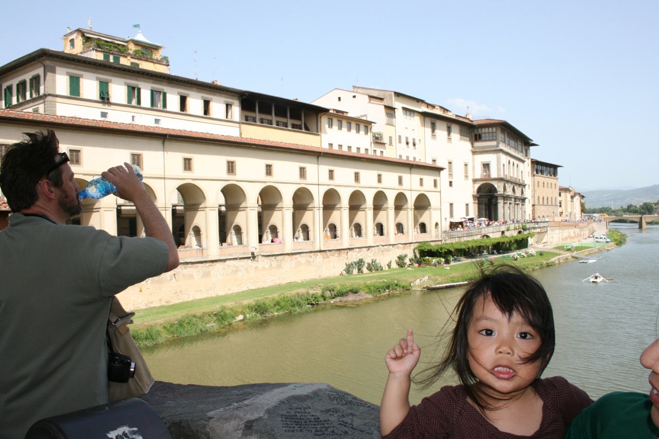 ヴェッキオ橋も相変わらずの人だかり。石造りのヨーロッパの街は風が抜けないところが多いが、狭い道が蛇行し広場も少ないフィレンツェはそれが顕著である。通常なら風が通って涼しい橋でさえ、両側に宝石店がびっしりと並んで、むしろより暑いほど。橋の中央部の開けた部分だけが、多少涼しい。