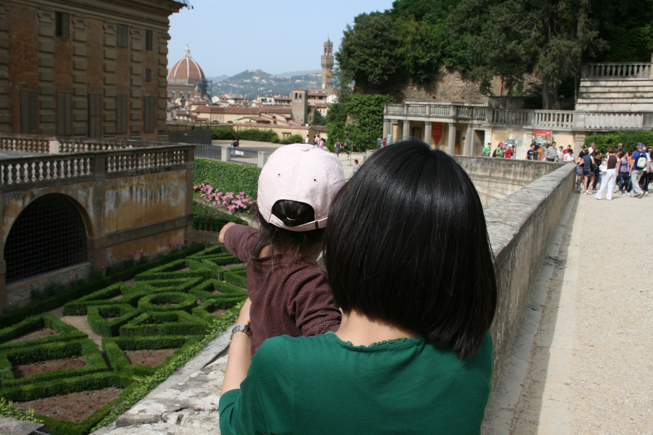 フィレンツェは美しい街だが、街の中にいる「埋もれている」ような息苦しさを覚えることもある。茶色い屋根の美しい街並みを楽しむのは、やはり高いところからが一番、ということで、丘の斜面に作られた庭園に入り、そこから街を眺める。長女も頑張って炎天下を歩いたりしていた。