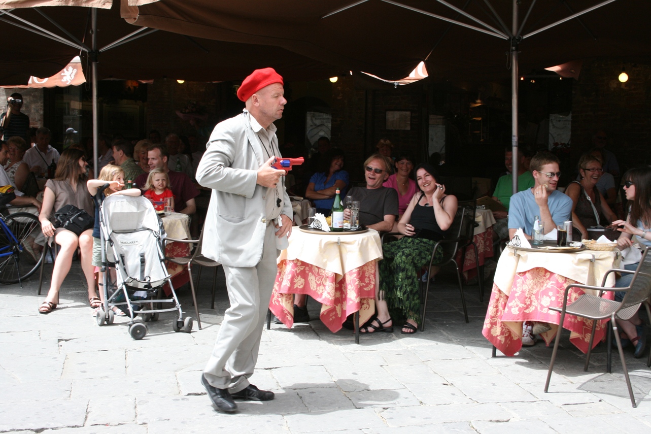 カンポ広場でランチを食べていると、カフェの前で大道芸人が芸を始めた。欧州では各地で大道芸人を見るが、この人物の芸はまた風変わりで、通りを行き交う観光客をからかう、というキワドイもの。霧吹きを突如拭いてみたり、おもちゃのピストルで通行人を撃つ真似をしてみたり、ツアーガイドを装って笛と旗で観光客を誘導してみたり、自らの赤い帽子を通行人にかぶせてみたりと、チップをせびるでもなく、延々と人々をからかい続けている。これがまた面白いので皆みな大笑い。からかわれた通行人も、ユーモアを理解してむしろ嬉しそうだったりする。