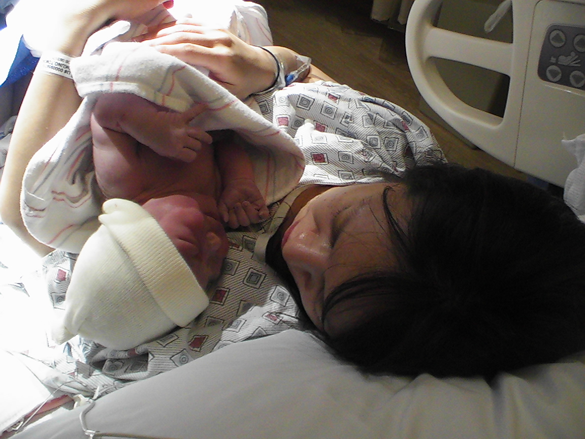 陣痛の波にあわせて息む。3回目くらいで、胎児がほぼ出口に到達する。4回目、半身が出ている。生々しい光景が目の前で繰り広げられ、妻には失礼ながらも、目を覆ってしまう。そして、5回目、無事赤ん坊が取り上げられ、へその緒が着いたまま、妻の腹の上に載せられた。