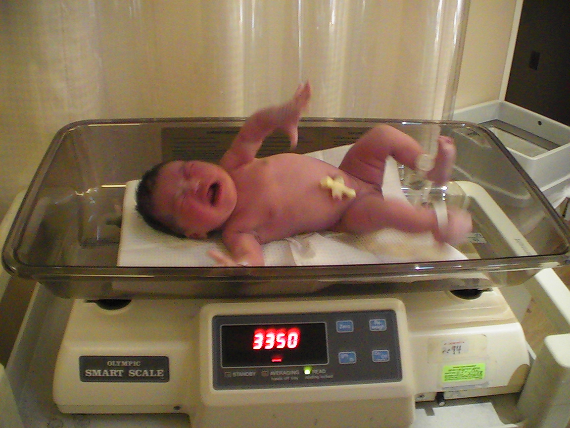 看護婦が妻の胸から赤ん坊を取り上げて体重計に載せる。3350グラム、やはりちょっと大きめか。