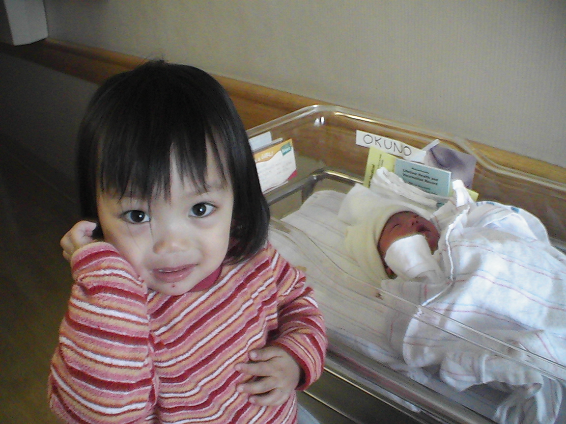 ベッドの赤ん坊を指して、「赤ちゃんが生まれたよ、妹だよ」と説明すると、暫く不思議そうに見ていたが、やがて指をさして「ベイビー」と呼んだ。目の前の物体を、認識したようである。